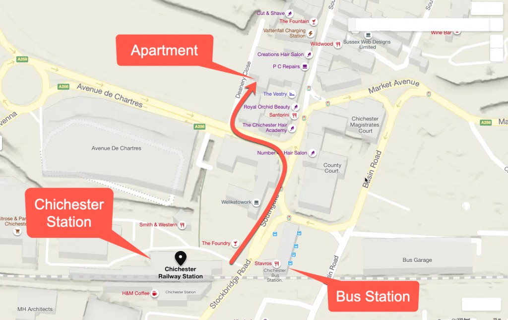We suggest you look for ‘Deanery Close, Chichester’, as this is the road that the rear entrance is located.